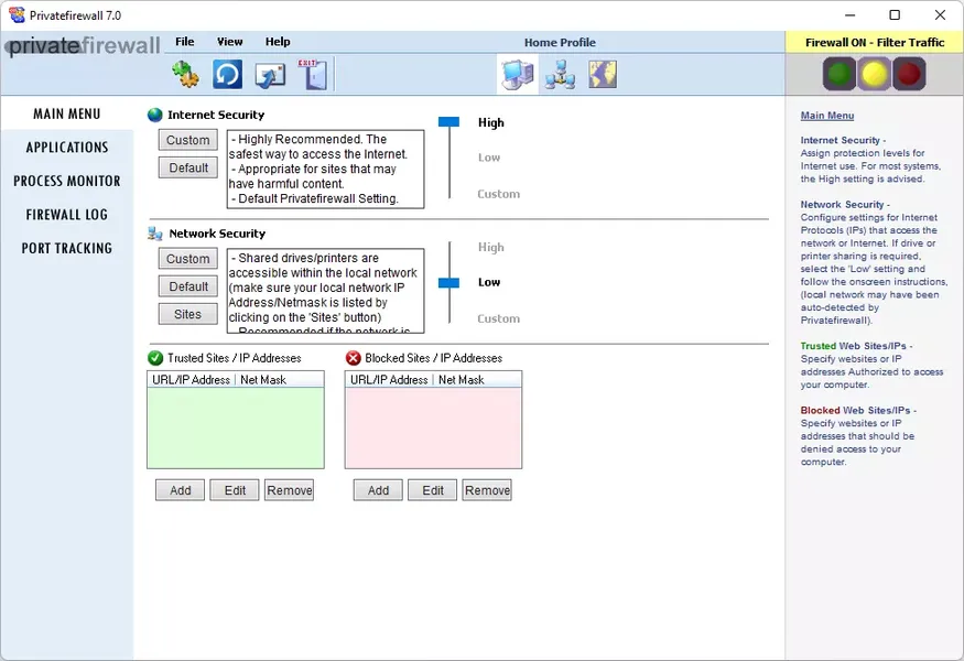 Privatefirewall предлагает три профиля, что позволяет легко переключаться между уникальными настройками и правилами фаервола. Список приложений, разрешенных или заблокированных, очень легко распознать и изменить. Вы можете добавлять новые приложения в список и четко видеть, какие из них заблокированы, а какие разрешены.
