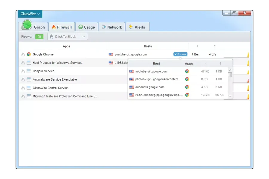 GlassWire — это не только фаервол, но и инструмент мониторинга сети, который предоставляет визуальную информацию о том, как используются ваши данные и какие приложения подключаются к интернету. Он уведомляет вас о подозрительной активности и позволяет блокировать нежелательные соединения всего в несколько кликов.