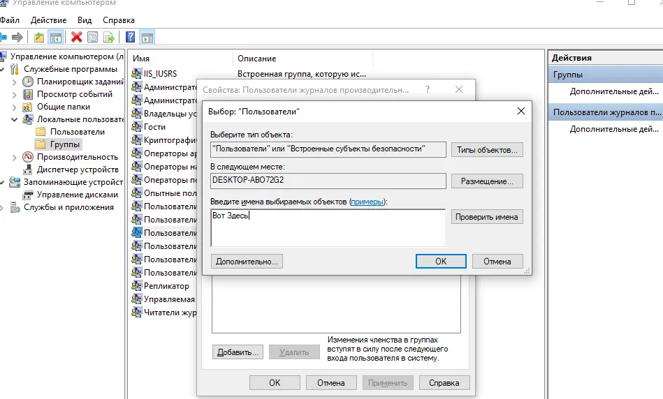 В списке имен справа найдите элемент «Пользователи журнала производительности» и дважды щелкните его. В появившемся окне «Свойства» нажмите «Добавить…». Следующим шагом будет добавление учетной записи администратора и вашей собственной учетной записи пользователя в поле имен объектов. Как видно на изображении.