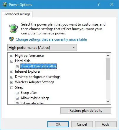 - Найдите раздел « Жесткий диск » и разверните его. Нажмите Отключить жесткий диск через и установите для него значение Никогда . Вы можете сделать это, введя 0 в качестве значения.